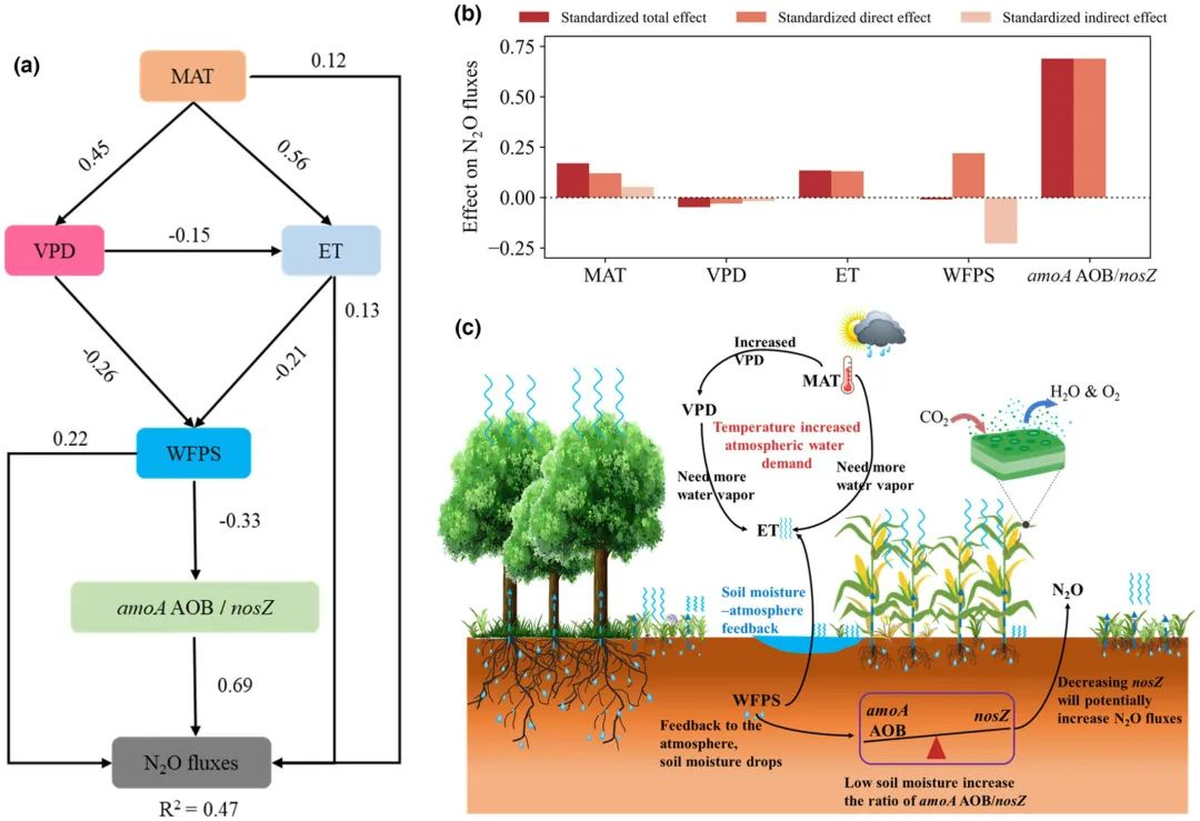 作者利用原位研究结合网格化和遥感数据分析全球N2O通量排放。研究了温度、水文气候对全球N2O通量的协同效应,即土壤湿度-大气反馈对N通量的影响。本研究结果表明大气需水量随温度的增加会降低土壤含水量,在土壤含水量较低的条件下,产生N2O的硝化菌(含有amoA AOB基因)增加,而消耗N2O的反硝化菌(含有nosZ基因)减少。本研究加深了对土壤水分-大气相互作用对土壤氮循环影响的理解,优化了N2O排放的地球系统模型。