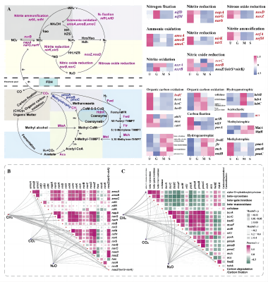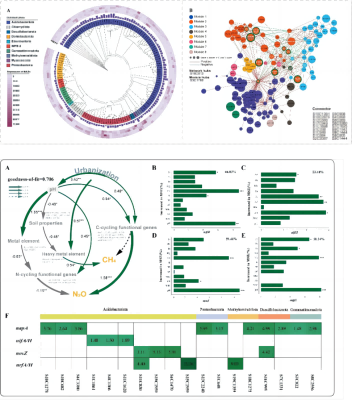 研究发现:1)城市森林的CH4和CO2排放高于城郊的,城市中心(校园)的N2O排放显著高于植物园、磨盘山和石燕湖;2)GHGs的变化与城市森林土壤细菌alpha多样性、相互作用和参与C、N循环进程的基因丰度密切相关;3)土壤pH和金属元素影响关键的细菌类群调控N2O排放,而重金属元素通过影响产甲烷菌和产甲烷营养细菌进而调控CH4排放。该研究结果表明以近自然和保护为基础的城市植物园可以为减少温室气体排放和城市化对人类健康的影响提供一个有效的途径。该研究对节约型城市规划和近自然的城市森林管建设的益处提供了新的见解,有助于通过调节核心细菌种群减少温室气体排放,支持未看不见的微生物世界和城市绿色可持续发展互联。
